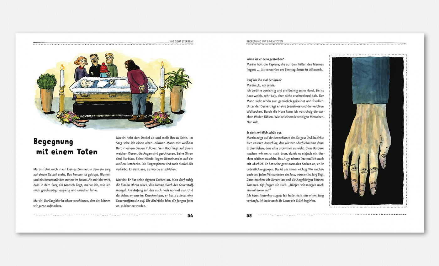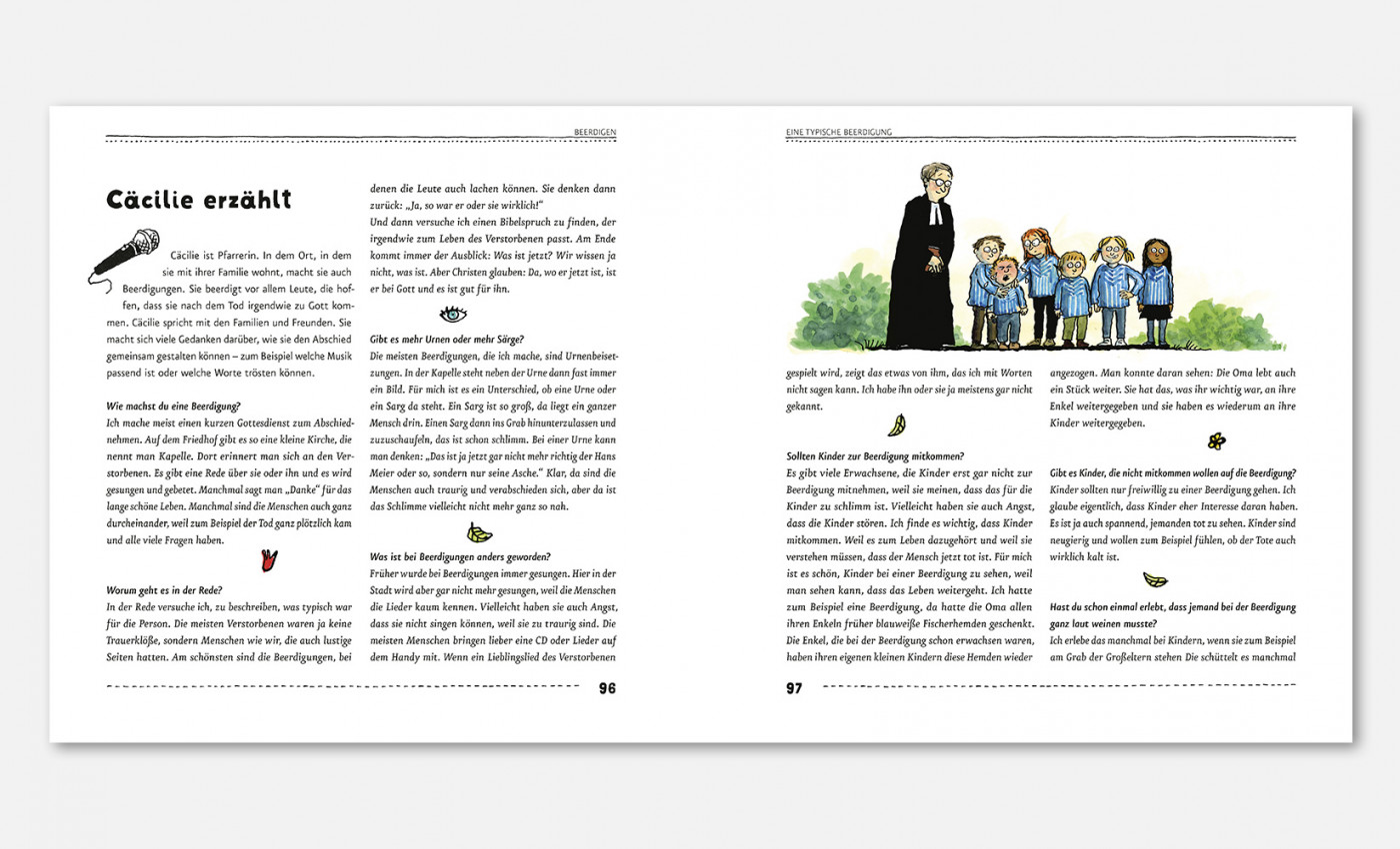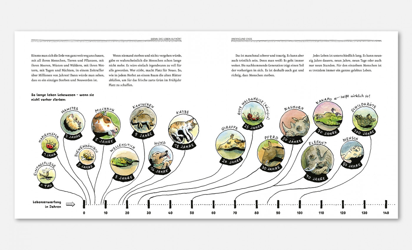 »LAUDATIO Sie gehören in unserer Kultur immer noch zu den Tabuthemen: Der Tod und das Sterben. Daher gibt es für Erwachsene oft fordernde Fragen, die nicht immer einfach zu beantworten sind, wenn Kinder plötzlich mit dem Ableben konfrontiert werden. Kinder sind nämlich in der Regel neugierig und wollen wissen, wie das ist mit dem Sterben – zum Beispiel wie es sich anfühlen könnte und was dabei eigentlich genau passiert. Dieses Buch von Katharina von der Gathen liefert mit viel Feingefühl und Achtsamkeit unzählige Informationen rund um dieses sensible Thema und schafft einen beachtenswerten Ausgleich zwischen Ernsthaftigkeit, Humor und Respekt, was die gewitzten Illustrationen von Anke Kuhl noch zusätzlich untermalen. Katharina von der Gathen, geboren 1973, studierte Sonderpädagogik und arbeitet als Sexualpädagogin und Autorin in Bonn, wo sie auch mit ihrem Mann und ihren vier Kindern lebt. Anke Kuhl, Jahrgang 1970, hat in Mainz und Offenbach das Zeichnen studiert und arbeitet seit 1998 in der Frankfurter Ateliergemeinschaft »labor«. Sie lebt mit ihrem Mann und zwei Kindern in Frankfurt am Main.«