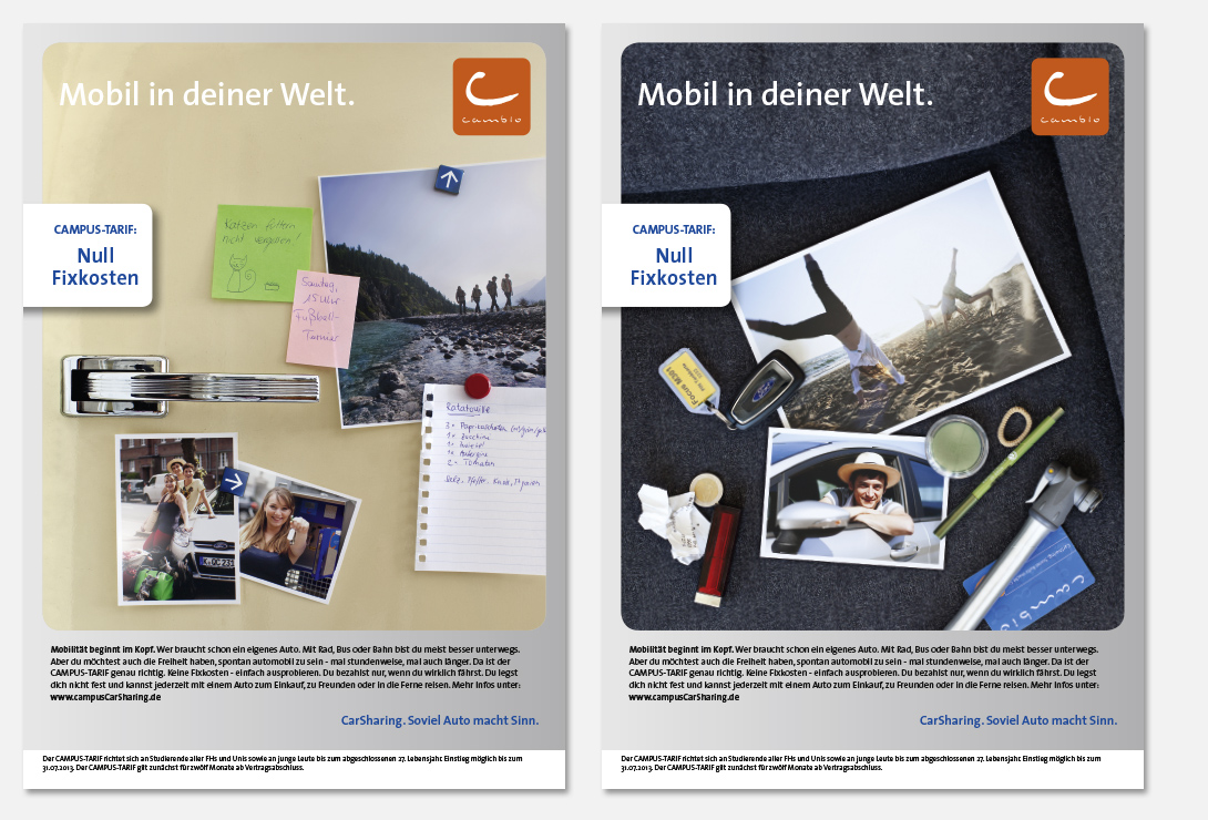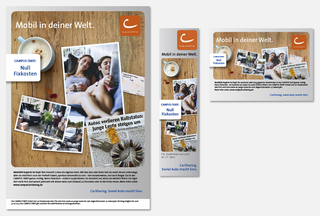 Für cambio haben wir die Einführungskampagne des Campus-Tarifs für Studenten und junge Leute entwickelt und umgesetzt. Ein neues Wegeleitsystem hilft bei der Orientierung und stärkt die Markenwahrnehmung im urbanen Umfeld.
